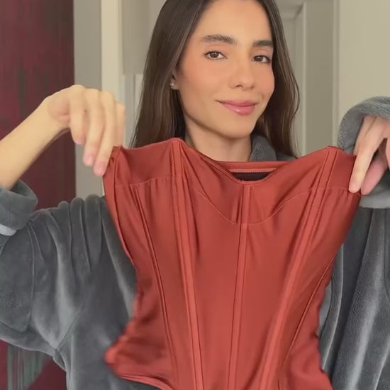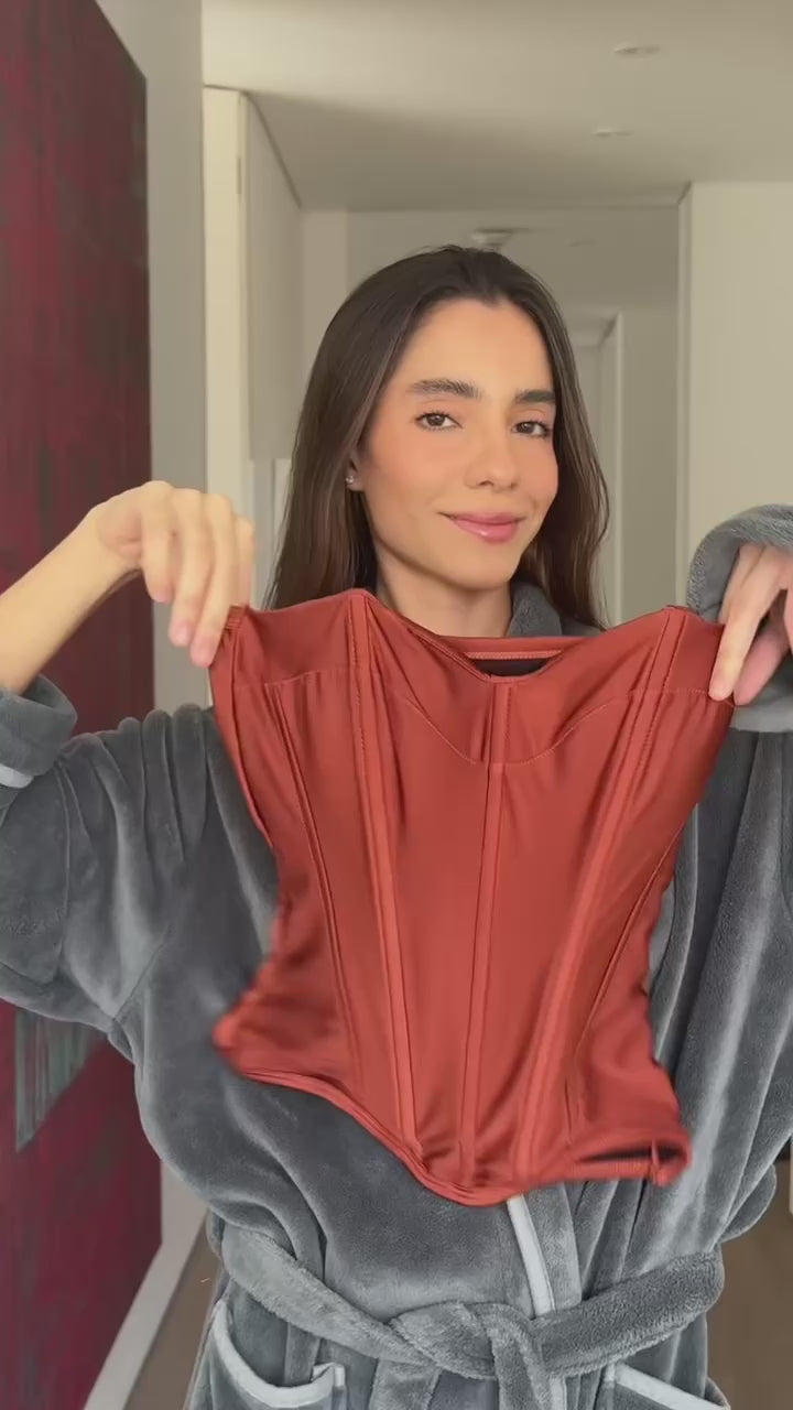 El strapless que siempre soñaste en un tono terracota elegante y un suave brillo. Horma perfecta y cómoda. No se resbala ni se cae. Perfecto para bustos pequeños y grandes.